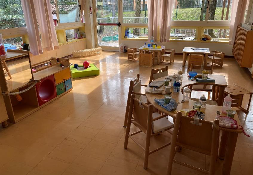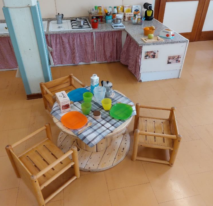 L’ambiente consente di muoversi liberamente, stare in relazione con gli altri, vivere gli spazi, ritrovare oggetti personali e materiali stimolanti. È Il bambino che modifica l’ambiente e da esso viene modificato, lasciando con il suo fare, tracce di sé e della sua esperienza.