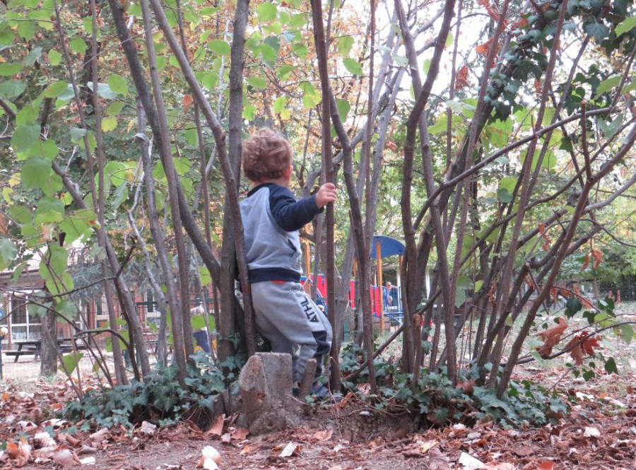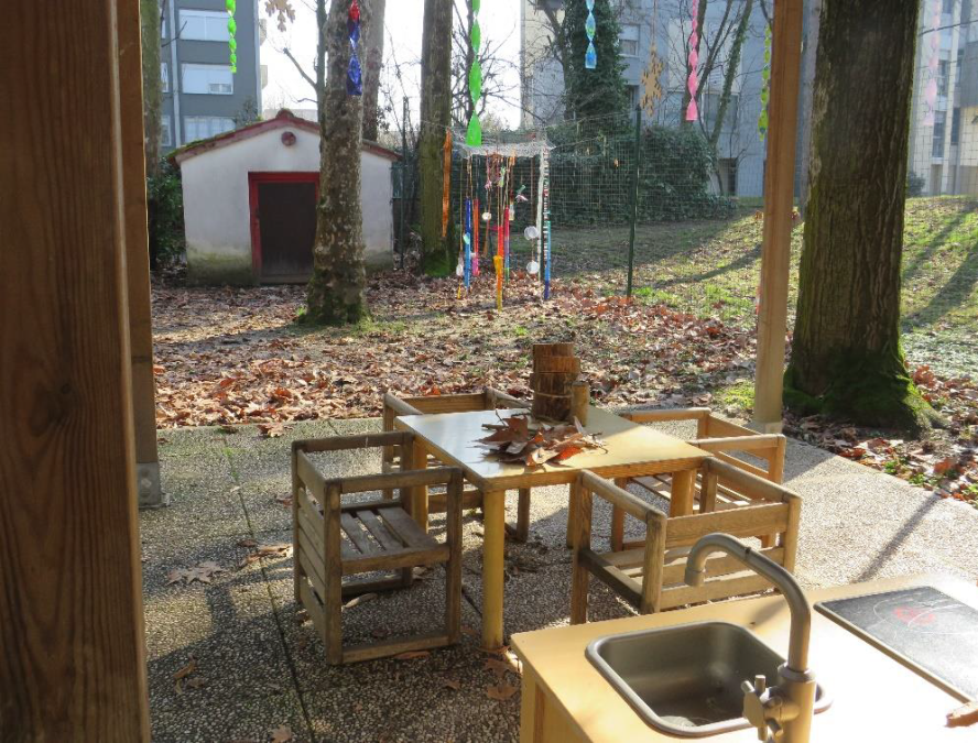 Gli spazi esterni sono attrezzati con tavoli, dove svolgere attività creative con i materiali naturali ma anche intraprendere esplorazioni e ricerche scientifiche sul campo: categorizzare, contestualizzare, fare di conto e arricchire il vocabolario linguistico dei bambini, sono solo alcune delle esperienze che l’ambiente esterno offre in continuità con quello interno.